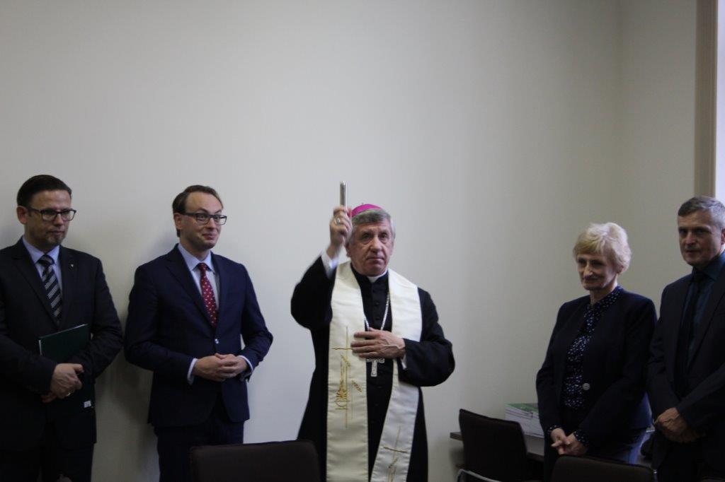 Prezes Rady Zachodniopomorskiej Izby Lekarsko-Weterynaryjnej w Szczecinie Marek Kubica, Krzysztof Kozłowski Wojewoda Zachodniopomorski, Arcybiskup Metropolita Diecezji Szczecińsko- Kamieńskiej Andrzej Dzięga w trakcie święcenia lokalu Izby , Powiatowy Lekarz Weterynarii w Gryficach Ewa Sobieszczyk oraz Powiatowy Lekarz Weterynarii w Wałczu Ryszard Sawicki