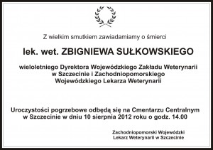 W dniu wczorajszym w godzinach wieczornych zmarł lekarz weterynarii Zbigniew Sułkowski, który przez wiele lat sprawował funkcję Wojewódzkiego Lekarza Weterynarii w Szczecinie , a po zmianie administracyjnej kraju od roku 1999 do przejścia na emeryturę w roku 2001 Zachodniopomorskiego Wojewódzkiego Lekarza Weterynarii w Szczecinie. Rodzinie i bliskim zmarłego najszczersze kondolencje składają Koleżanki i Koledzy Lekarze Weterynarii.