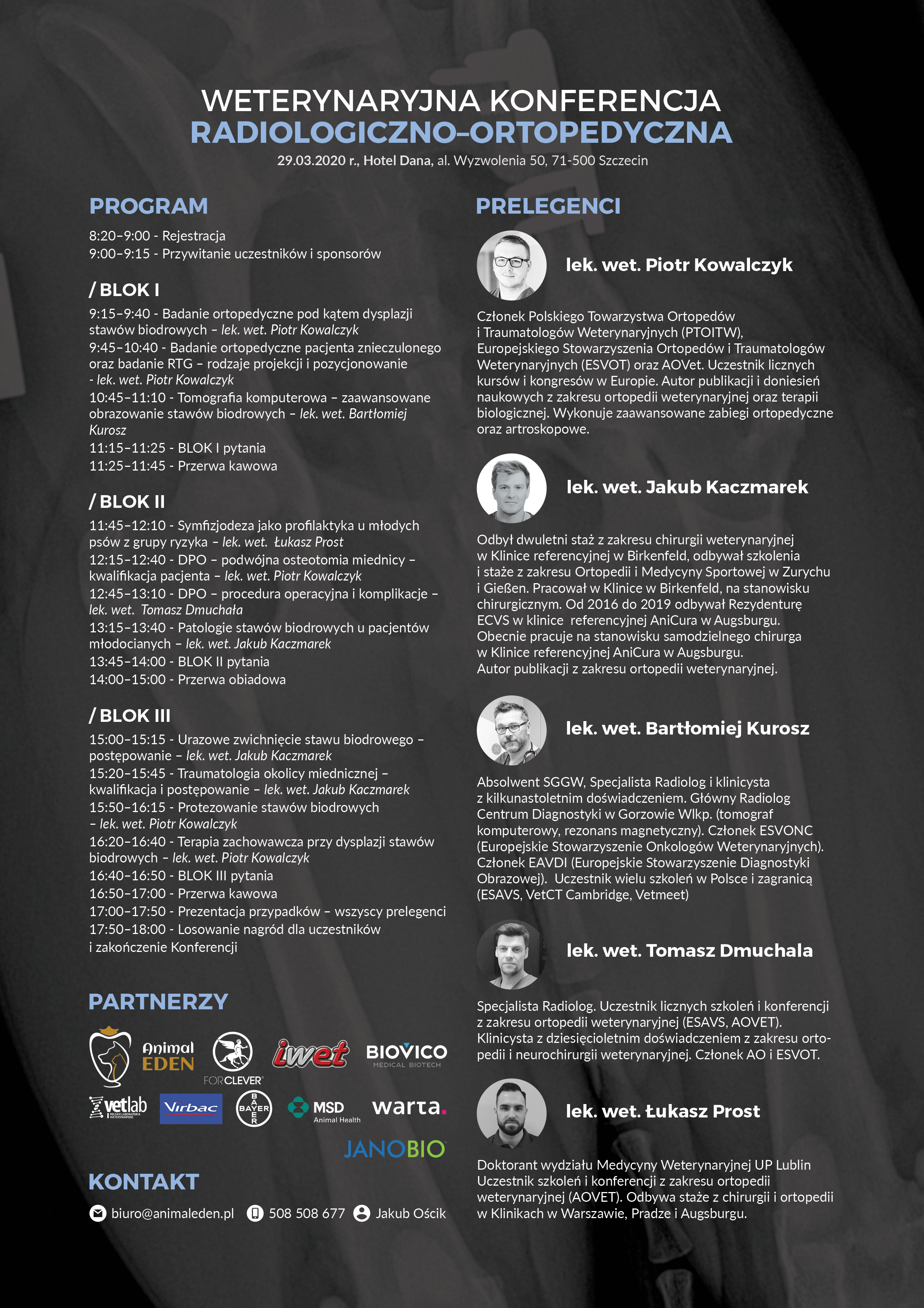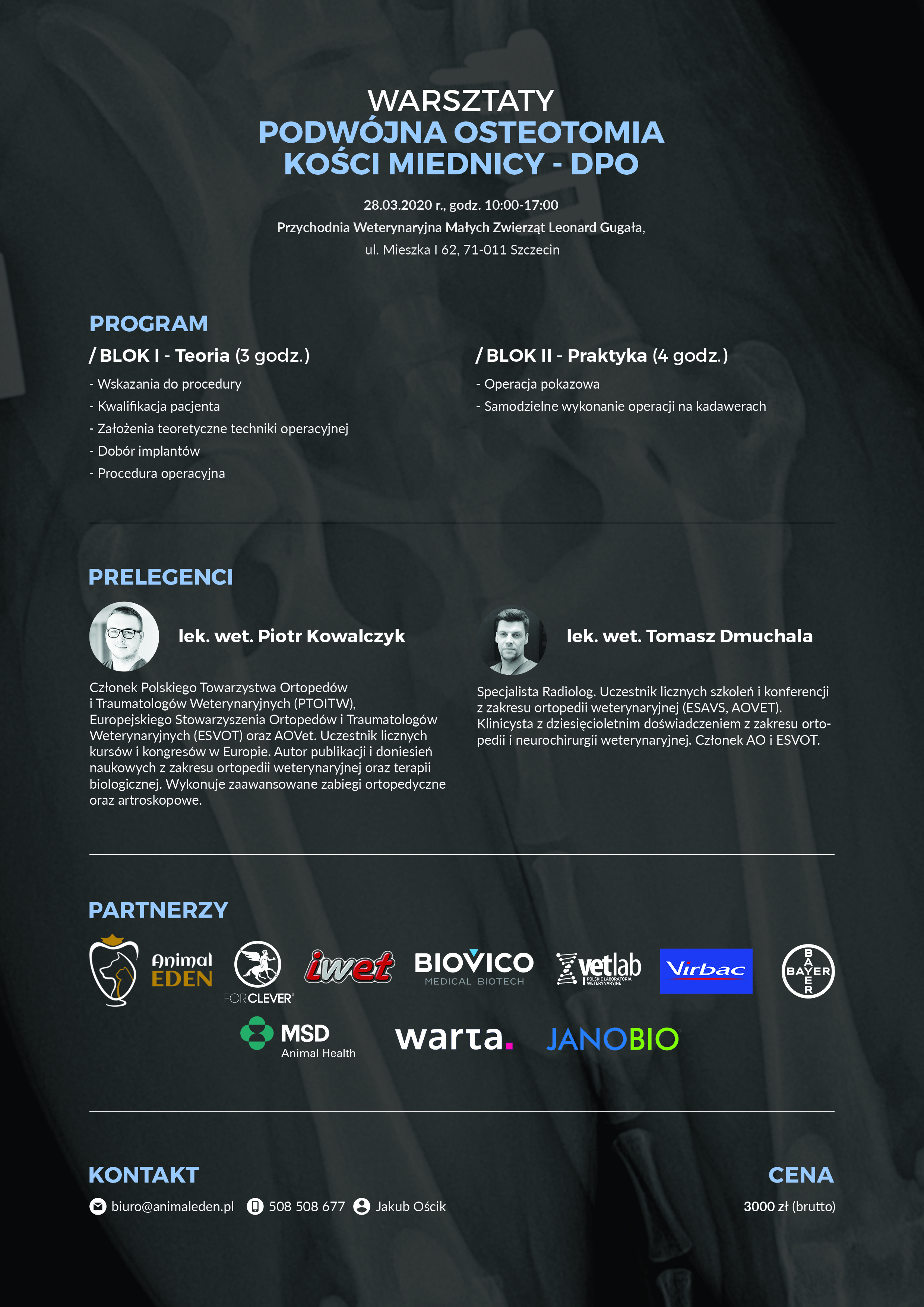W imieniu organizatorów oraz własnym zapraszamy do wzięcia udziału w Konferencji Radiologiczno-Ortopedycznej. Koszt uczestnictwa w wykładach dla członków naszej izby to 300 zł, dla członków pozostałych izb 450 zł. Koszt warsztatów dla chętnych to 3000 zł. Kontakt organizatora: Jakub Ościk, tel. 508508677, biuro@animaleden.pl. Zachodniopomorska Izba Lekarsko-Weterynaryjna objęła patronatem szkolenie wraz z dofinansowaniem.